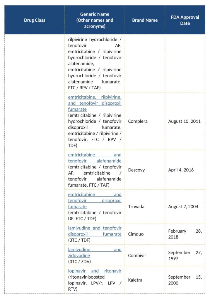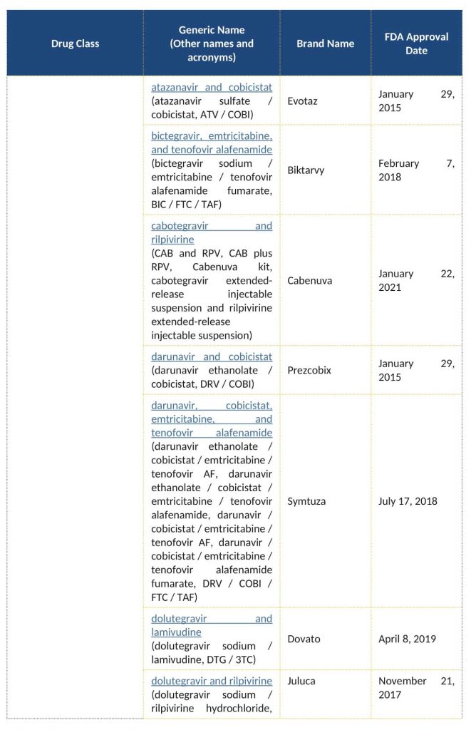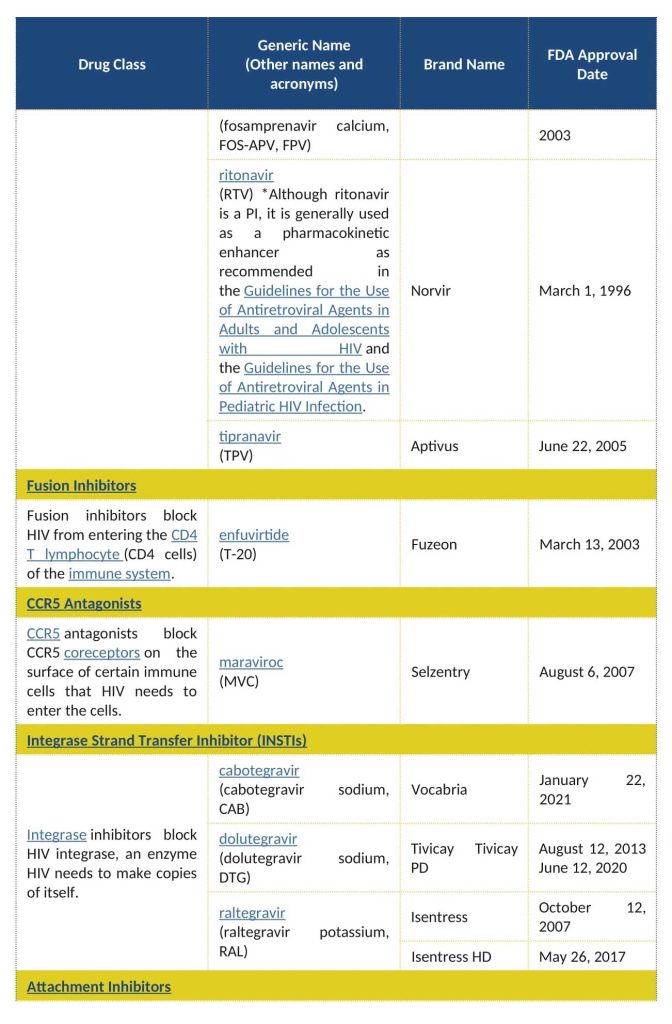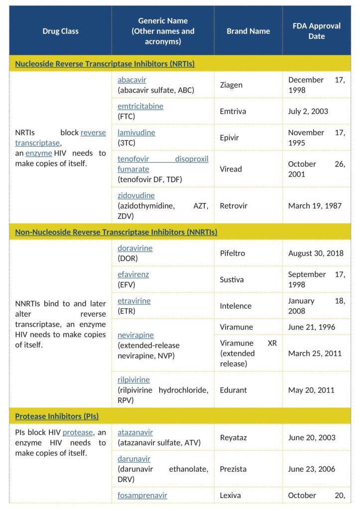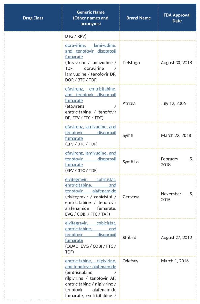 Untuk menambah pengetahuan mengenai obat-obat HIV yang tersedia berdasarkan golongan obatnya, tabel di bawah ini menampilkan daftar obat HIV yang direkomendasikan untuk pengobatan infeksi HIV di Amerika Serikat berdasarkan the U.S. Department of Health and Human Services (HHS) HIV/AIDS medical practice guidelines. Seluruh obat tersebut telah disetujui penggunaannya oleh the U.S. Food and Drug Administration (FDA). Daftar obat HIV tersebut disusun berdasarkan golongan obat, nama paten, dan nama generik.