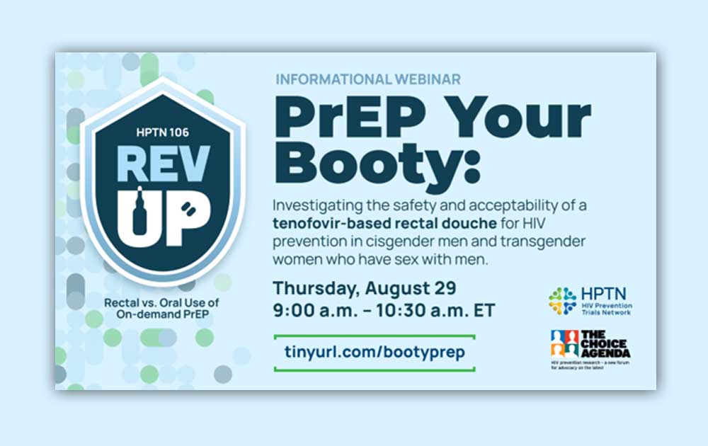 HPTN 106 (REV UP) merupakan uji klinis inovatif dari the HIV Prevention Trials Network yang akan meneliti keamanan dan penerimaan rectal douches berbasis tenofovir sebagai upaya pencegahan HIV untuk kalangan pria cisgender dan wanita transgender yang berhubungan seks dengan lelaki. Dengarkan langsung dari para peneliti HPTN 106 dalam webinar ini.