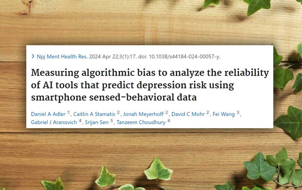 Adler DA, Stamatis CA, Meyerhoff J, Mohr DC, Wang F, Aranovich GJ, Sen S, Choudhury T. Measuring algorithmic bias to analyze the reliability of AI tools that predict depression risk using smartphone sensed-behavioral data. Npj Ment Health Res. 2024 Apr 22;3(1):17. doi: 10.1038/s44184-024-00057-y. PMID: 38649446; PMCID: PMC11035598.