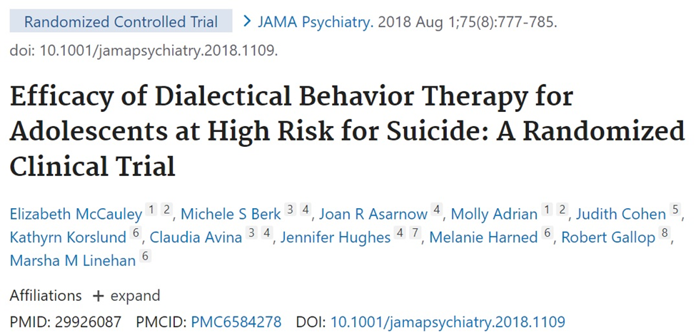 Kalimat Kutipan: McCauley E, Berk MS, Asarnow JR, Adrian M, Cohen J, Korslund K, Avina C, Hughes J, Harned M, Gallop R, Linehan MM. Efficacy of Dialectical Behavior Therapy for Adolescents at High Risk for Suicide: A Randomized Clinical Trial. JAMA Psychiatry. 2018 Aug 1;75(8):777-785. doi: 10.1001/jamapsychiatry.2018.1109. Erratum in: JAMA Psychiatry. 2018 Aug 1;75(8):867. doi: 10.1001/jamapsychiatry.2018.2137. PMID: 29926087; PMCID: PMC6584278.
