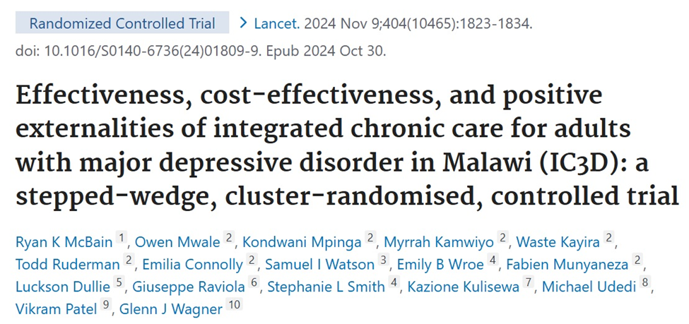 Kalimat Kutipan: McBain RK, Mwale O, Mpinga K, Kamwiyo M, Kayira W, Ruderman T, Connolly E, Watson SI, Wroe EB, Munyaneza F, Dullie L, Raviola G, Smith SL, Kulisewa K, Udedi M, Patel V, Wagner GJ. Effectiveness, cost-effectiveness, and positive externalities of integrated chronic care for adults with major depressive disorder in Malawi (IC3D): a stepped-wedge, cluster-randomised, controlled trial. Lancet. 2024 Nov 9;404(10465):1823-1834. doi: 10.1016/S0140-6736(24)01809-9. Epub 2024 Oct 30. PMID: 39488229.
