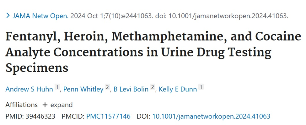 Kalimat Kutipan: Huhn AS, Whitley P, Bolin BL, Dunn KE. Fentanyl, Heroin, Methamphetamine, and Cocaine Analyte Concentrations in Urine Drug Testing Specimens. JAMA Netw Open. 2024 Oct 1;7(10):e2441063. doi: 10.1001/jamanetworkopen.2024.41063. Erratum in: JAMA Netw Open. 2024 Nov 4;7(11):e2449821. doi: 10.1001/jamanetworkopen.2024.49821. PMID: 39446323; PMCID: PMC11577146.
