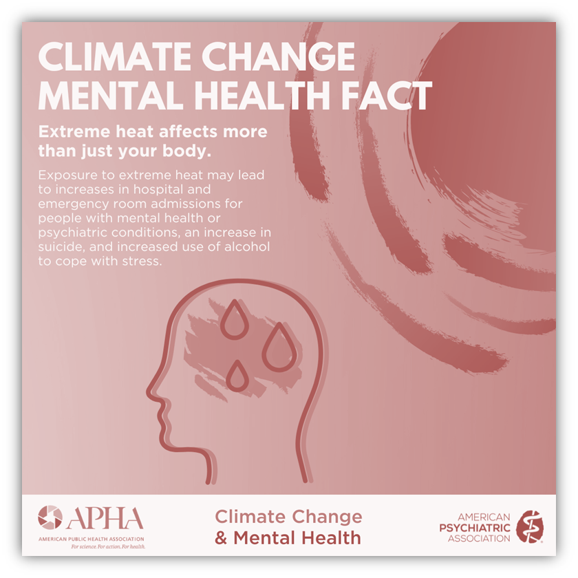 Bagi sebagian besar orang, dampak bencana bagi kesehatan jiwa meliputi stres ringan dan insomnia, perilaku koping risiko tinggi seperti meningkatnya konsumsi alkohol, dan gangguan jiwa seperti depresi, kecemasan, dan stres pasca-trauma. Peningkatan iklim yang berkaitan dengan peningkatan suhu global mempengaruhi masyarakat melalui bencana lokal terbatas, namun juga efek jangka panjang yang sering berskala besar yang berasal dari mengalami bencana yang berulang dan efeknya bagi kesejahteraan, stabilitas ekonomi, dan infrastruktur di wilayah yang terdampak. Hal ini dapat meliputi stres komunitas yang kumulatif, peningkatan kekerasan dalam rumah tangga (KDRT) akibat kemiskinan, dan gangguan penyalahgunaan narkoba serta migrasi terpaksa. Banjir dan kekeringan yang berkepanjangan juga dikaitkan dengan kondisi kesehatan jiwa seperti meningkatnya kecemasan, depresi, bunuh diri, dan gangguan stres pasca trauma (post-traumatic stress disorders) (US GCRP).