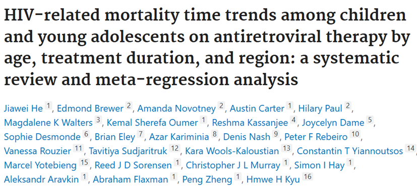 Kalimat Kutipan: He J, Brewer E, Novotney A, Carter A, Paul H, Walters MK, Sherefa Oumer K, Kassanjee R, Dame J, Desmonde S, Eley B, Kariminia A, Nash D, Rebeiro PF, Rouzier V, Sudjaritruk T, Wools-Kaloustian K, Yiannoutsos CT, Yotebieng M, Sorensen RJD, Murray CJL, Hay SI, Aravkin A, Flaxman A, Zheng P, Kyu HH. HIV-related mortality time trends among children and young adolescents on antiretroviral therapy by age, treatment duration, and region: a systematic review and meta-regression analysis. Lancet HIV. 2025 Sep 2:S2352-3018(25)00168-7. doi: 10.1016/S2352-3018(25)00168-7. Epub ahead of print. PMID: 40912259.