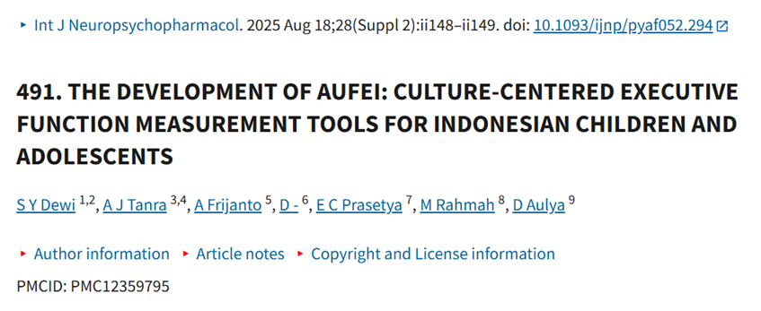 Kalimat Kutipan: Dewi SY, Tanra AJ, Frijanto A, – D, Prasetya EC, Rahmah M, Aulya D. 491. THE DEVELOPMENT OF AUFEI: CULTURE-CENTERED EXECUTIVE FUNCTION MEASUREMENT TOOLS FOR INDONESIAN CHILDREN AND ADOLESCENTS. Int J Neuropsychopharmacol. 2025 Aug 18;28(Suppl 2):ii148–9. doi: 10.1093/ijnp/pyaf052.294. PMCID: PMC12359795.