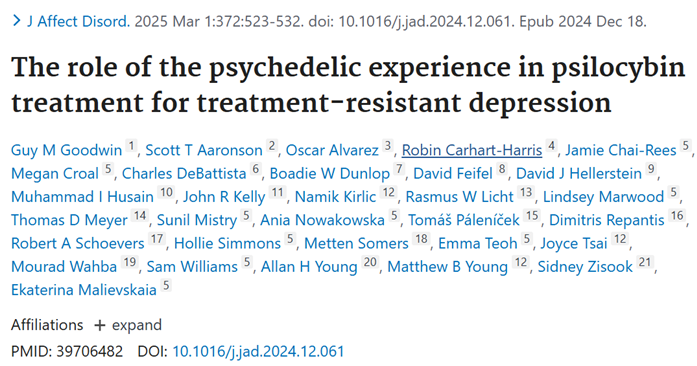 Kalimat Kutipan: Goodwin GM, Aaronson ST, Alvarez O, Carhart-Harris R, Chai-Rees J, Croal M, DeBattista C, Dunlop BW, Feifel D, Hellerstein DJ, Husain MI, Kelly JR, Kirlic N, Licht RW, Marwood L, Meyer TD, Mistry S, Nowakowska A, Páleníček T, Repantis D, Schoevers RA, Simmons H, Somers M, Teoh E, Tsai J, Wahba M, Williams S, Young AH, Young MB, Zisook S, Malievskaia E. The role of the psychedelic experience in psilocybin treatment for treatment-resistant depression. J Affect Disord. 2025 Mar 1;372:523-532. doi: 10.1016/j.jad.2024.12.061. Epub 2024 Dec 18. Erratum in: J Affect Disord. 2026 Jan 15;393(Pt A):120352. doi: 10.1016/j.jad.2025.120352. PMID: 39706482.